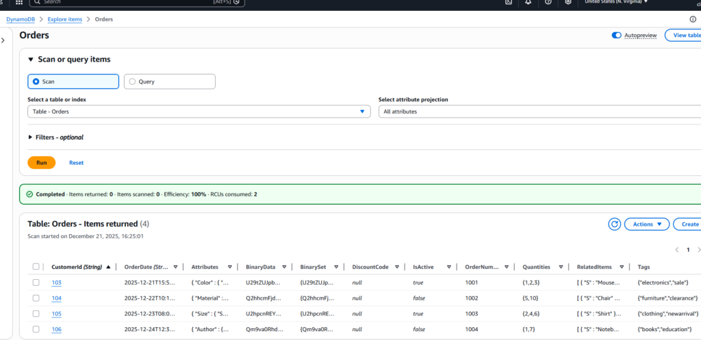 In my AWS console, I have created a Dynamo DB table CustomerOrders and inserted 4 records each having unique CustomerId (my partition key) and OrderDate as a sort key.