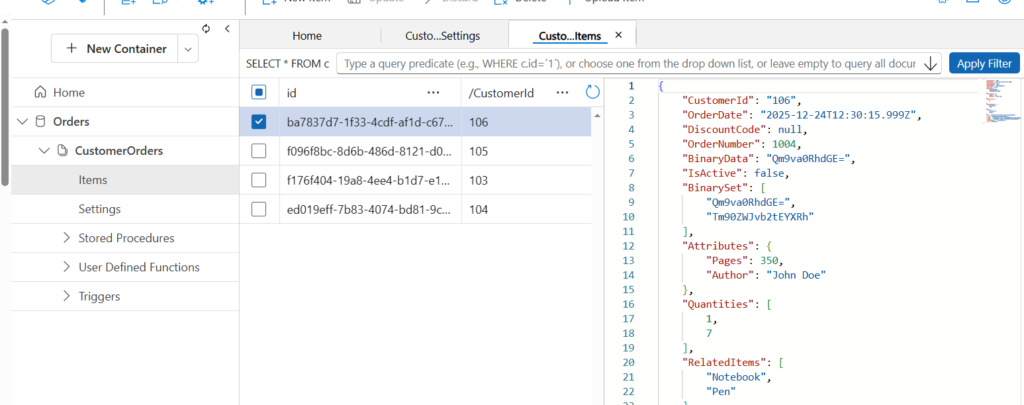In the above image, database name is Orders and container name is CustomerOrders. The Cosmos DB doesn’t need a sort key specially.
