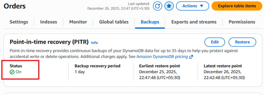 Turn on the PITR (Point in time recovery) mode for the Dynamo table under Backups.